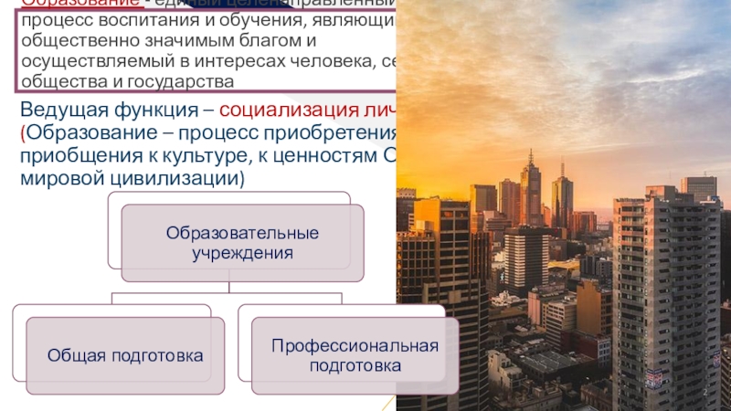Ведущая функция – социализация личности(Образование – процесс приобретения знаний о мире, приобщения к культуре, к ценностям Отечества, мировой цивилизации)