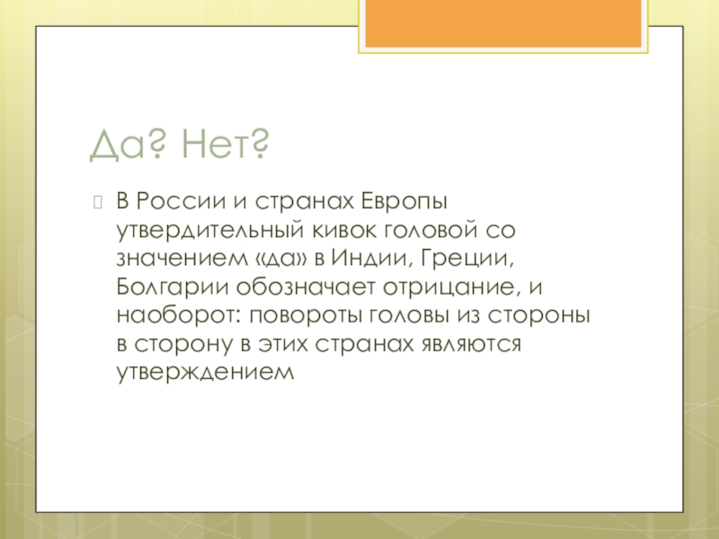 Да? Нет?В России и странах Европы утвердительный кивок головой со значением «да» в Индии, Греции, Болгарии обозначает