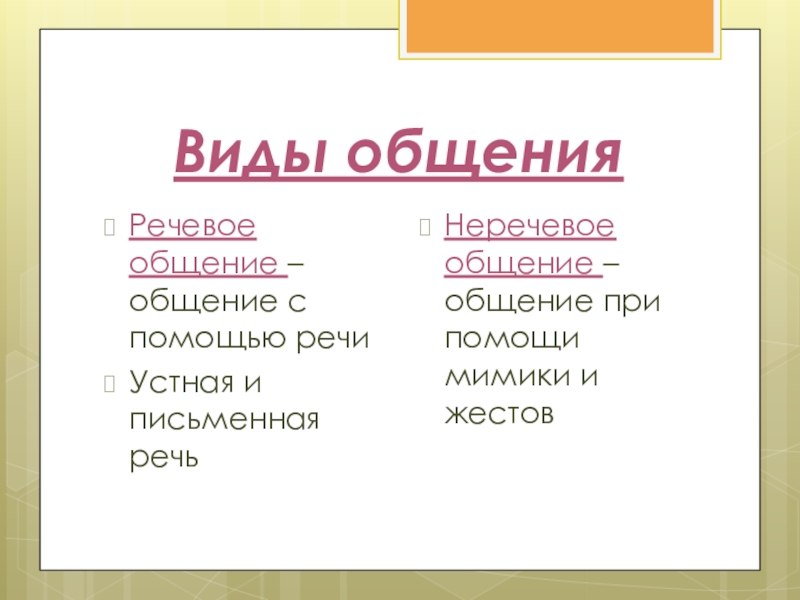 Виды общенияРечевое общение – общение с помощью речиУстная и письменная речьНеречевое общение – общение при помощи мимики