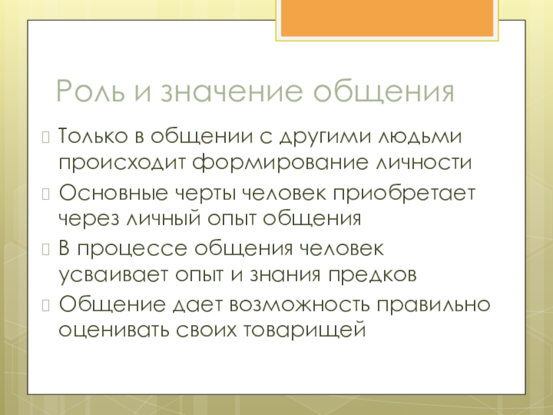 Роль и значение общенияТолько в общении с другими людьми происходит формирование личностиОсновные черты человек приобретает через личный