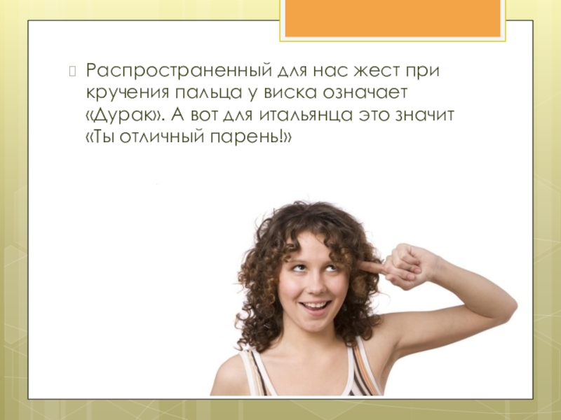 Слайд 18Распространенный для нас жест при кручения пальца у виска означает «Дурак».