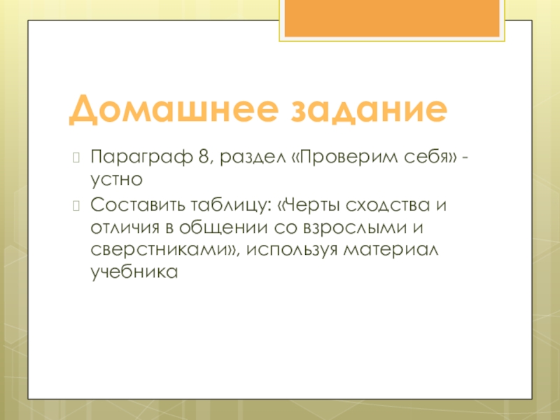 Домашнее заданиеПараграф 8, раздел «Проверим себя» - устноСоставить таблицу: «Черты сходства и отличия в общении со взрослыми