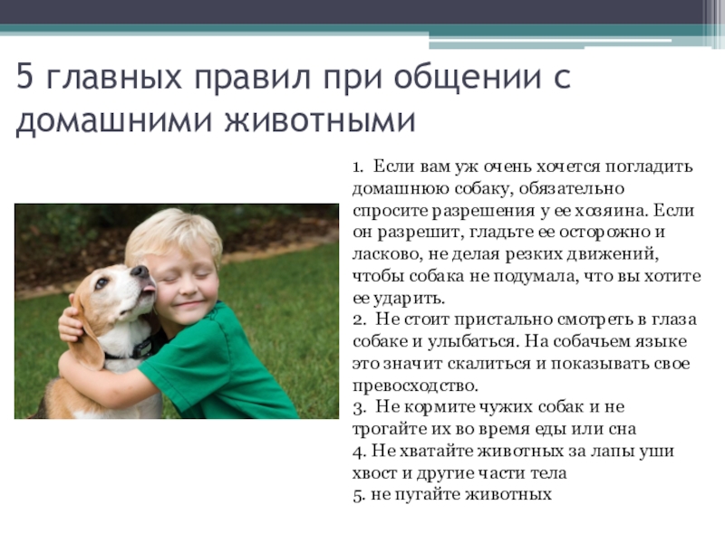 3. Не кормите чужих собак и не трогайте их во время еды или сна 4. Не хватайте животных за лапы уши хвост и другие части тела 5. не пугайте животных