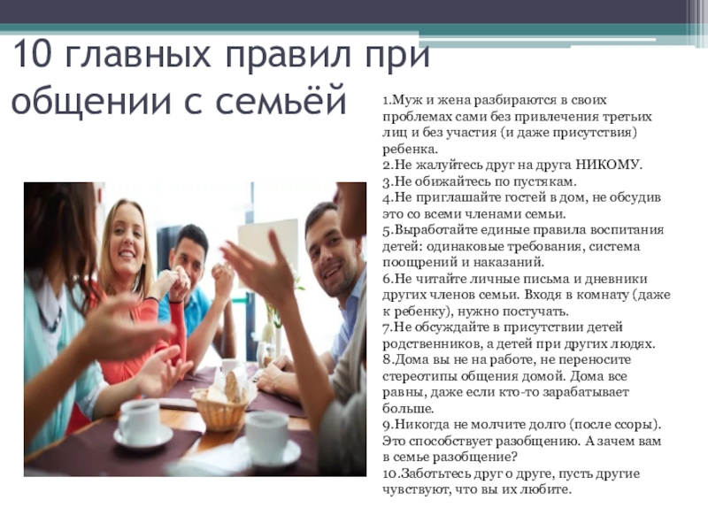 10 главных правил при общении с семьёй1.Муж и жена разбираются в своих проблемах сами без привлечения третьих лиц и без участия (и даже присутствия) ребенка.2.Не жалуйтесь друг на друга НИКОМУ.3.Не обижайтесь по пустякам.4.Не приглашайте гостей в