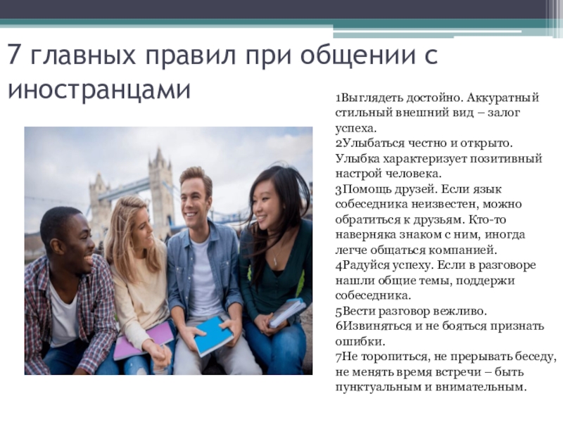 7 главных правил при общении с иностранцами1Выглядеть достойно. Аккуратный стильный внешний вид – залог успеха.2Улыбаться честно и