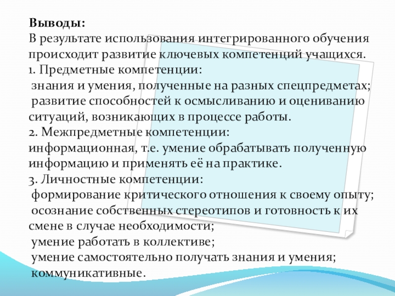 В результате использования интегрированного обучения происходит развитие ключевых компетенций учащихся.