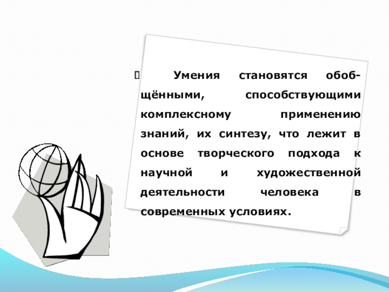 Слайд 33 Умения становятся обоб-щёнными, способствующими комплексному применению знаний, их синтезу, что