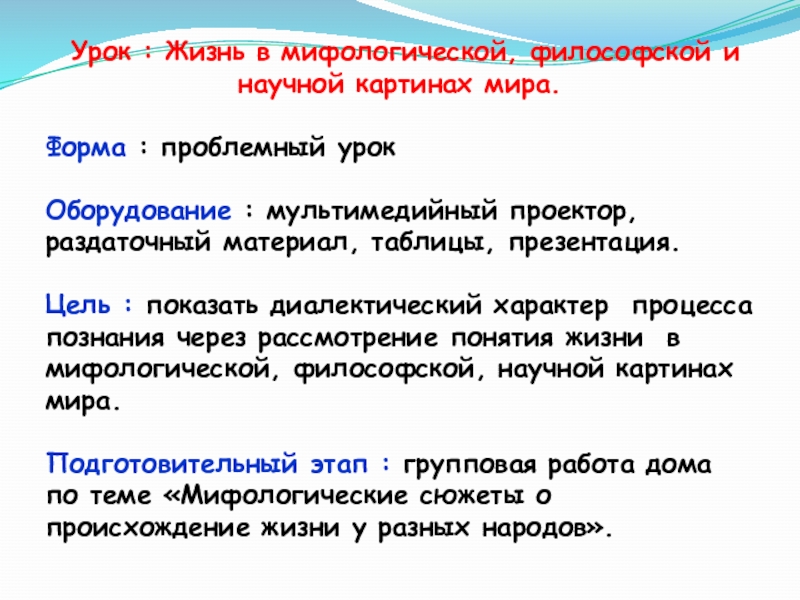 Цель : показать диалектический характер процесса познания через рассмотрение понятия жизни в мифологической, философской, научной картинах мира.