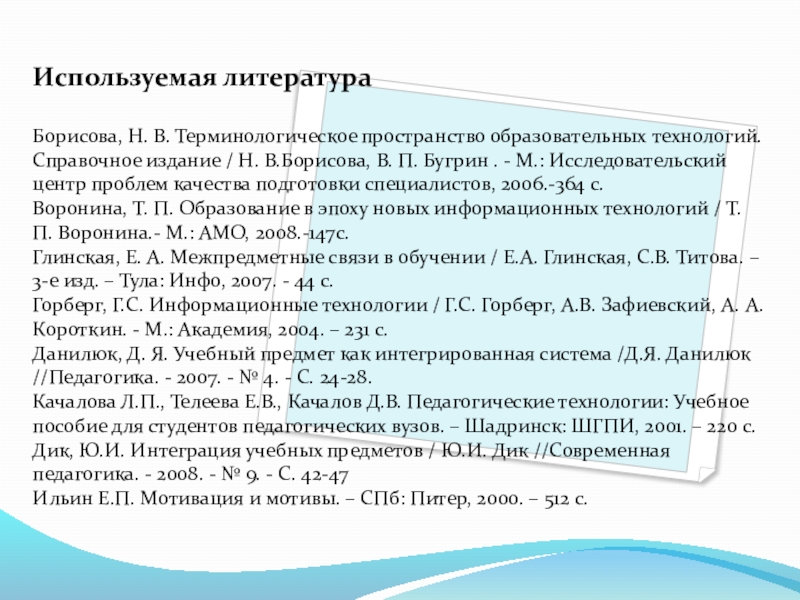 Глинская, Е. А. Межпредметные связи в обучении / Е.А. Глинская, С.В. Титова. – 3-е изд. – Тула: Инфо, 2007. - 44 с.