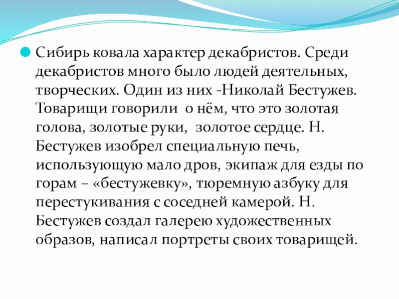 Один из них -Николай Бестужев. Товарищи говорили о нём, что это золотая голова, золотые руки, золотое сердце. Н. Бестужев изобрел специальную печь, использующую мало дров, экипаж для езды по горам – «бестужевку», тюремную азбуку для перестукивания с соседней камерой. Н.Бестужев создал галерею художественных образов, написал портреты своих товарищей.