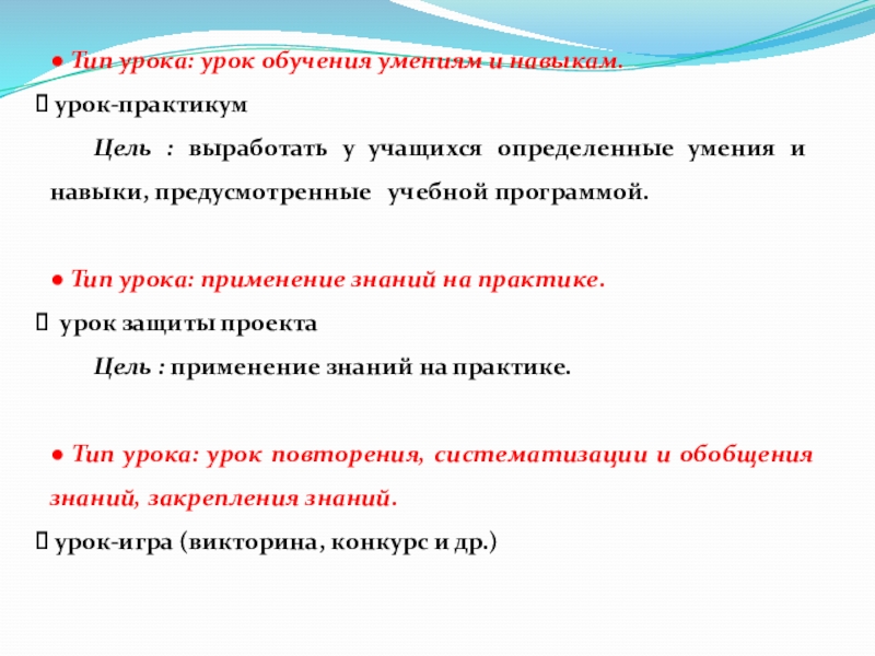 Слайд 12● Тип урока: урок обучения умениям и навыкам.
