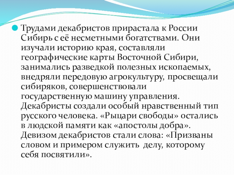 изучали историю края, составляли географические карты Восточной Сибири, занимались разведкой полезных ископаемых, внедряли передовую агрокультуру, просвещали сибиряков, совершенствовали государственную машину управления. Декабристы создали особый нравственный тип русского человека. «Рыцари свободы» остались в людской памяти как «апостолы добра». Девизом декабристов стали слова: «Призваны словом и примером служить делу, которому себя посвятили».