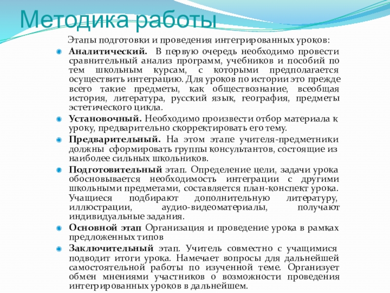 Подготовительный этап. Определение цели, задачи урока обосновывается необходимость интеграции с другими школьными предметами, составляется план-конспект урока. Учащиеся подбирают дополнительную литературу, иллюстрации, аудио-видеоматериалы, получают индивидуальные задания.
