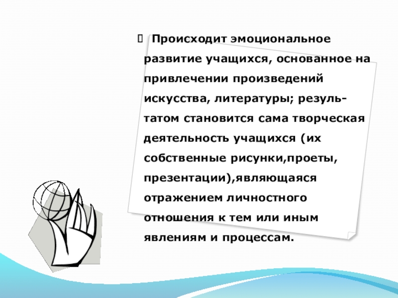 Слайд 35 Происходит эмоциональное развитие учащихся, основанное на привлечении произведений искусства, литературы;