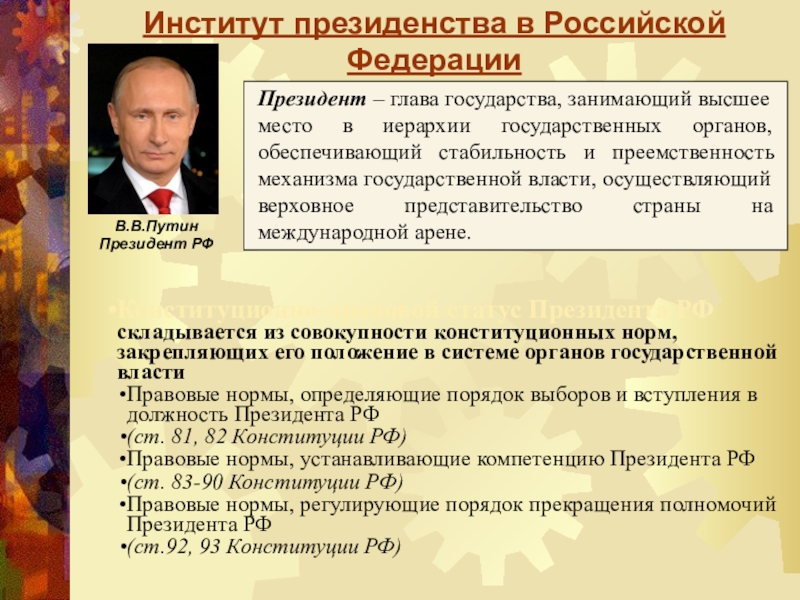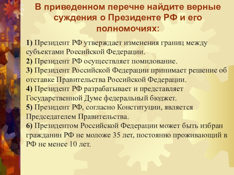 6) Президентом Российской Федерации может быть избран гражданин РФ не моложе 35 лет, постоянно проживающий в РФ не менее 10 лет.