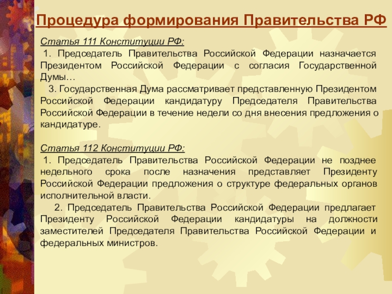 Председатель Правительства РФ предлагает Президенту РФ кандидатуры на должности заместителей Председателя Правительства Российской Федерации и федеральных министров.