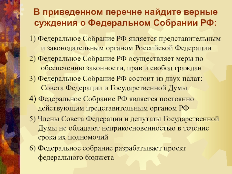 4) Президент РФ разрабатывает и представляет Государственной Думе федеральный бюджет.