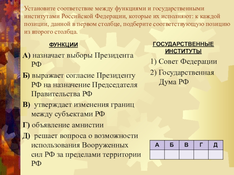 Д) решает вопроса о возможности использования Вооруженных сил РФ за пределами территории РФ