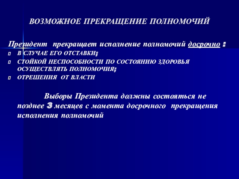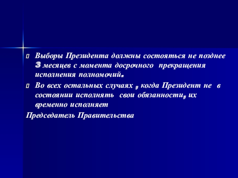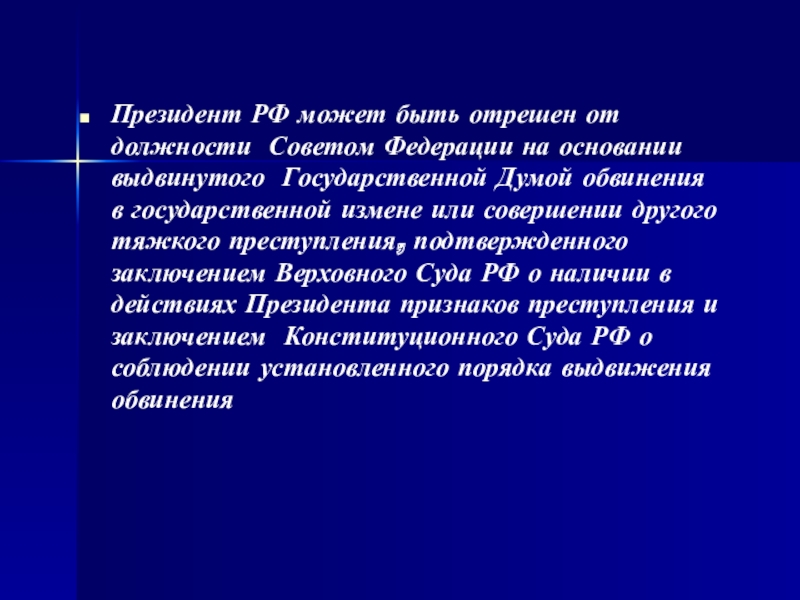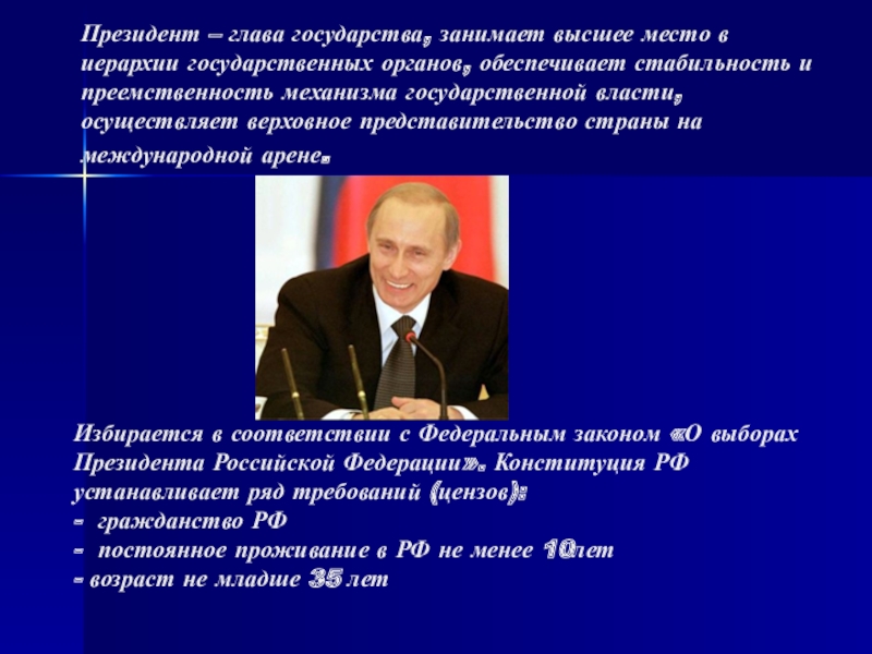Избирается в соответствии с Федеральным законом «О выборах Президента Российской Федерации». Конституция РФ устанавливает ряд требований (цензов):