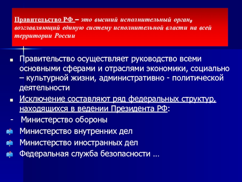 Правительство осуществляет руководство всеми основными сферами и отраслями экономики, социально – культурной жизни, административно - политической деятельности