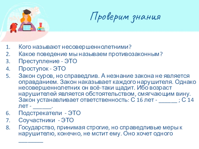 Закон суров, но справедлив. А незнание закона не является оправданием. Закон наказывает каждого нарушителя. Однако несовершеннолетних он всё-таки щадит. Ибо возраст нарушителей является обстоятельством, смягчающим вину. Закон устанавливает ответственность: С 16 лет - ______ ; С 14 лет - ______.