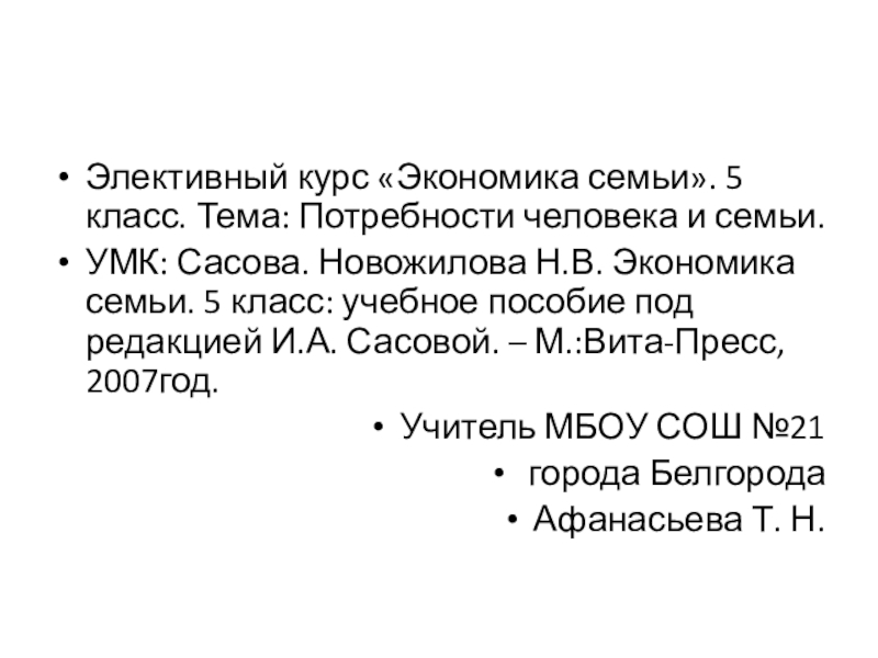 Сасова. Новожилова Н.В. Экономика семьи. 5 класс: учебное пособие под редакцией И.А. Сасовой. – М.:Вита-Пресс, 2007год.