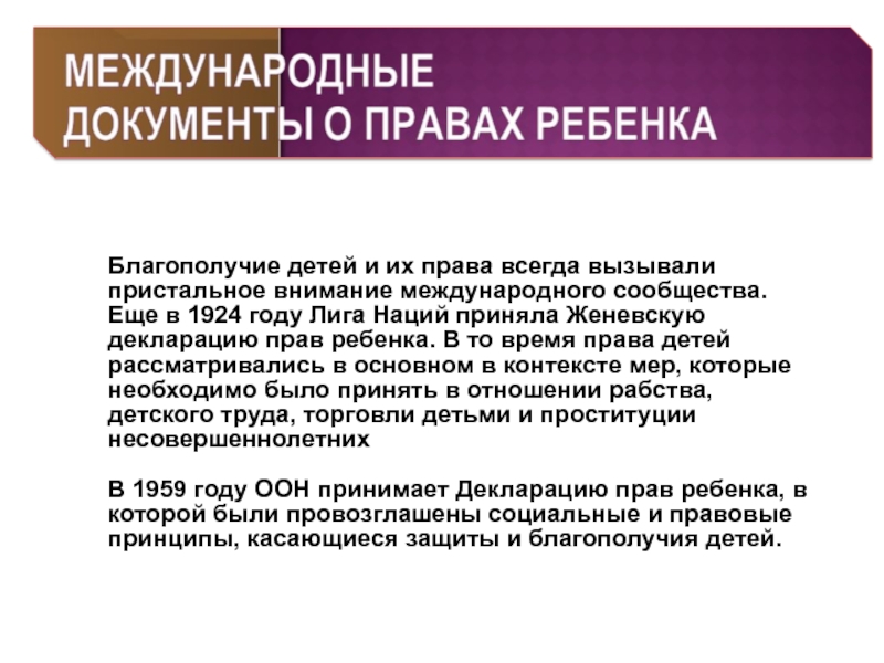 Еще в 1924 году Лига Наций приняла Женевскую декларацию прав ребенка. В то время права детей рассматривались в основном в контексте мер, которые необходимо было принять в отношении рабства, детского труда, торговли детьми и проституции несовершеннолетних