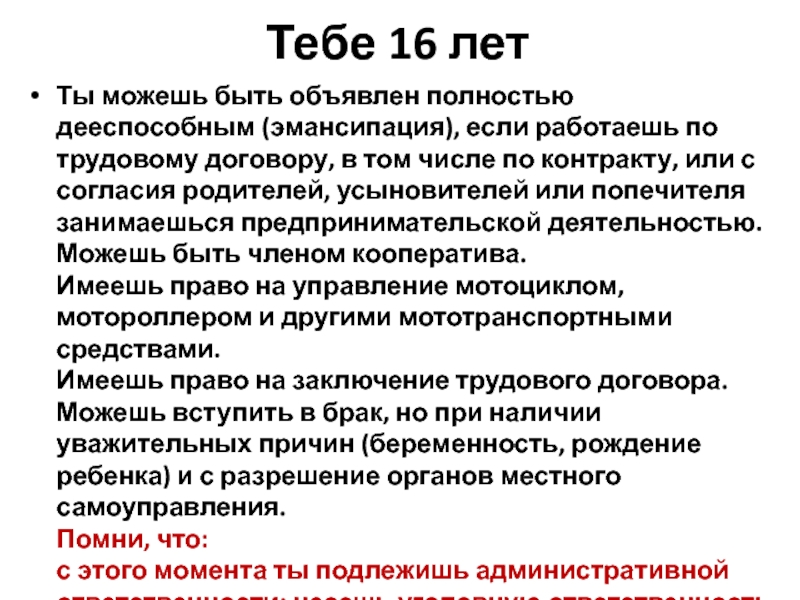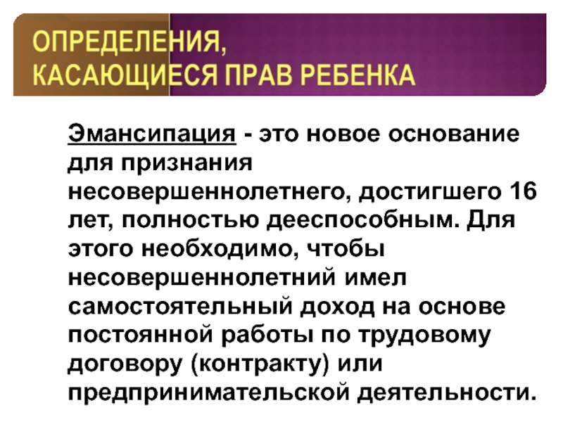 Слайд 8Эмансипация - это новое основание для признания несовершеннолетнего, достигшего 16 лет,