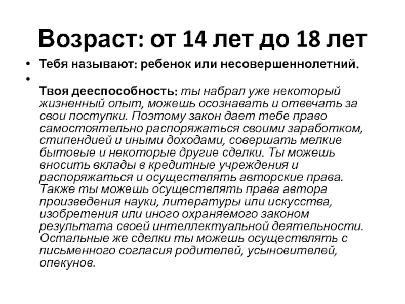 дееспособность: ты набрал уже некоторый жизненный опыт, можешь осознавать и отвечать за свои поступки. Поэтому закон дает тебе право самостоятельно распоряжаться своими заработком, стипендией и иными доходами, совершать мелкие бытовые и некоторые другие сделки. Ты можешь вносить вклады в кредитные учреждения и распоряжаться и осуществлять авторские права. Также ты можешь осуществлять права автора произведения науки, литературы или искусства, изобретения или иного охраняемого законом результата своей интеллектуальной деятельности. Остальные же сделки ты можешь осуществлять с письменного согласия родителей, усыновителей, опекунов.