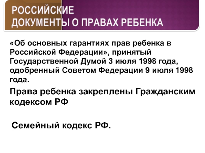 Слайд 6«Об основных гарантиях прав ребенка в Российской Федерации», принятый Государственной Думой