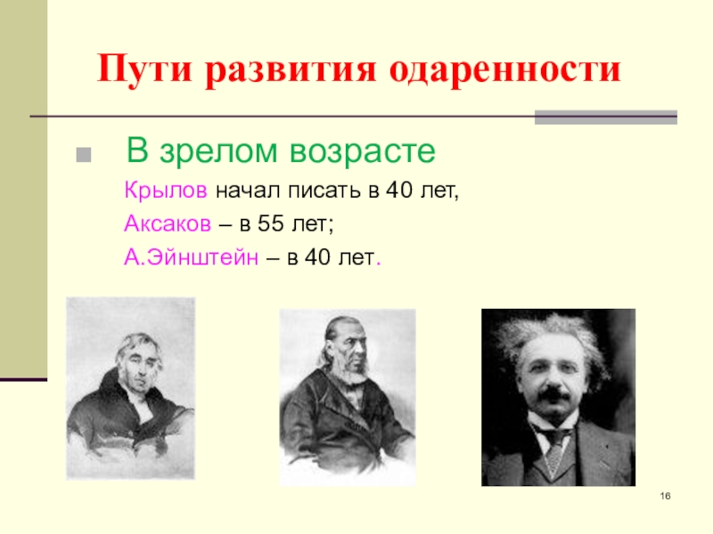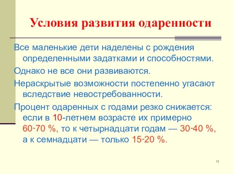 Процент одаренных с годами резко снижается: если в 10-летнем возрасте их примерно 60‑70 %, то к четырнадцати годам — 30‑40 %, а к семнадцати — только 15‑20 %.