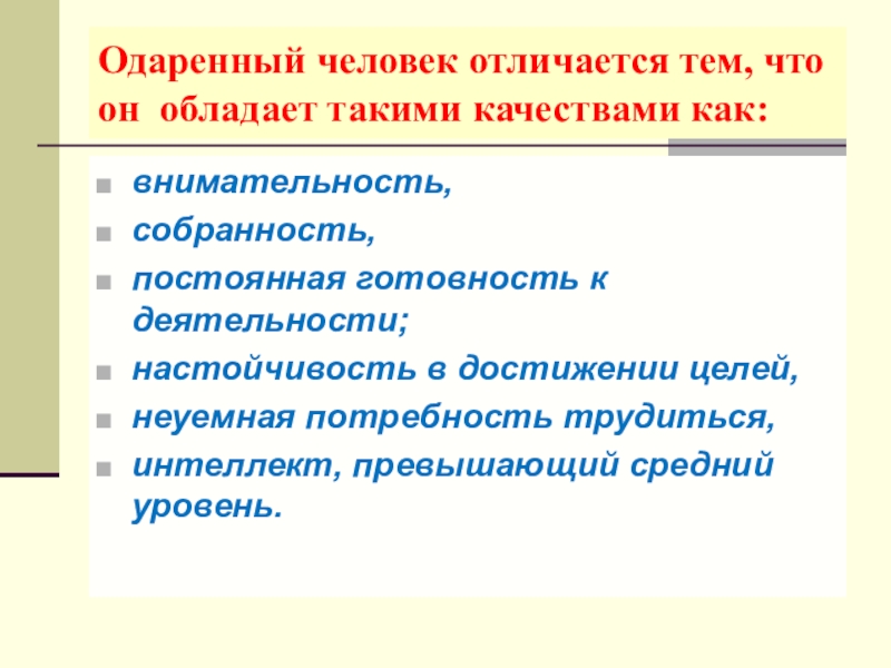 Слайд 10Одаренный человек отличается тем, что он обладает такими качествами как: