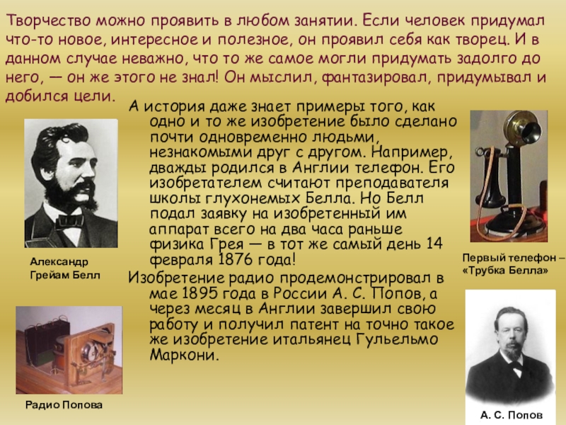 А история даже знает примеры того, как одно и то же изобретение было сделано почти одновременно людьми, незнакомыми друг с другом. Например, дважды родился в Англии телефон. Его изобретателем считают преподавателя школы глухонемых Белла. Но Белл подал заявку на изобретенный им аппарат всего на два часа раньше физика Грея — в тот же самый день 14 февраля 1876 года!