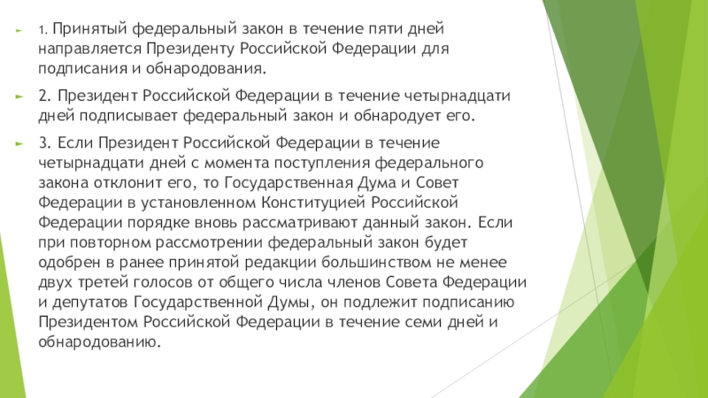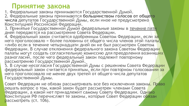Федеральный закон считается принятым в том случае, если за его принятие проголосует большинство от общего числа депутатов ГД.