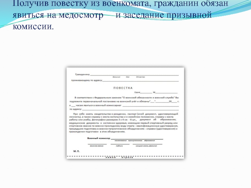 Слайд 16Получив повестку из военкомата, гражданин обязан явиться на медосмотр