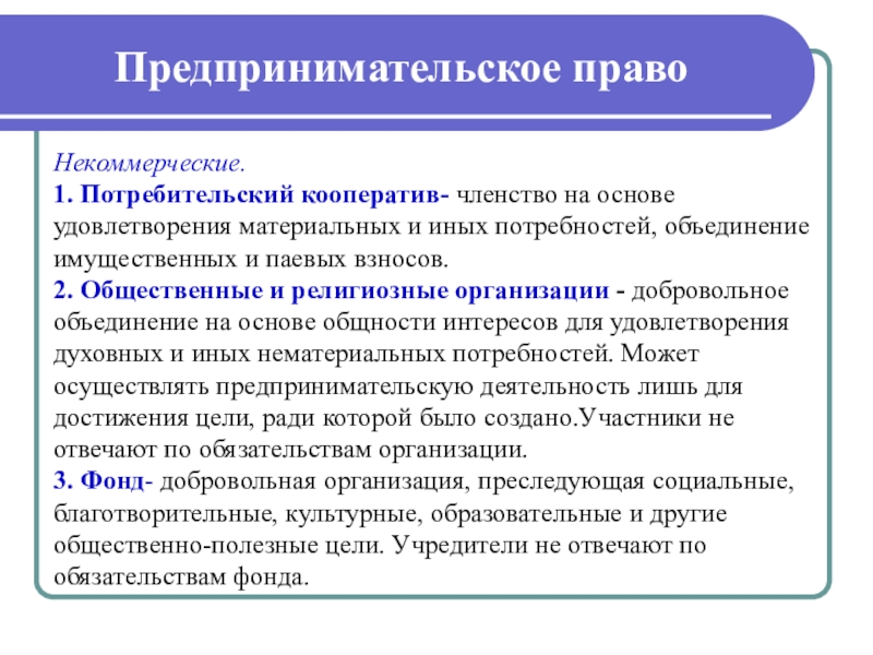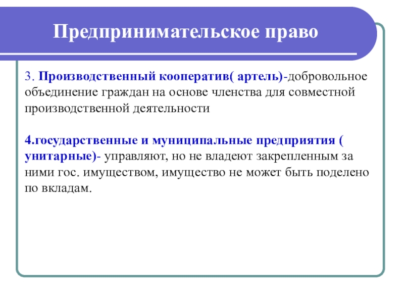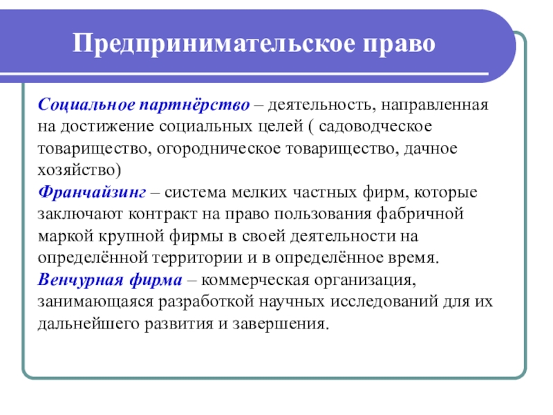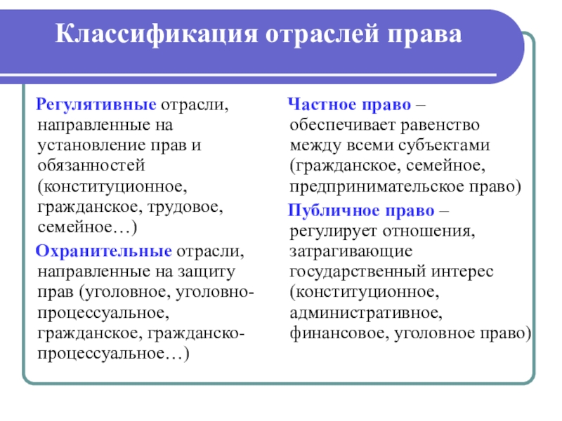 Частное право – обеспечивает равенство между всеми субъектами (гражданское, семейное, предпринимательское право)