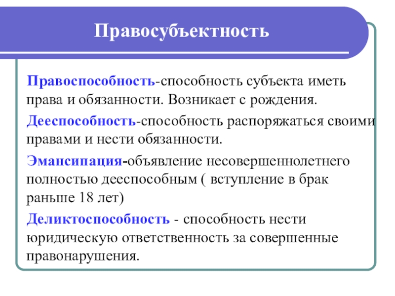 Субъекты - участник правоотношения, который имеет право - управомоченное лицо, на которого возложена обязанность - обязанный субъект.