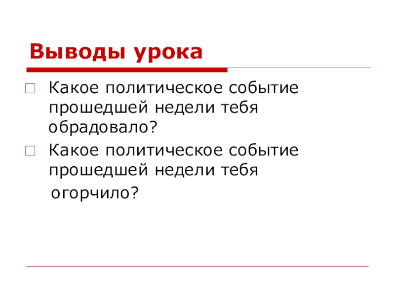 Выводы урокаКакое политическое событие прошедшей недели тебя обрадовало?Какое политическое событие прошедшей недели тебя   огорчило?
