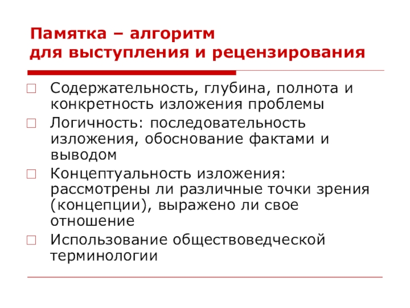 Памятка – алгоритм  для выступления и рецензированияСодержательность, глубина, полнота и конкретность изложения проблемыЛогичность: последовательность изложения, обоснование