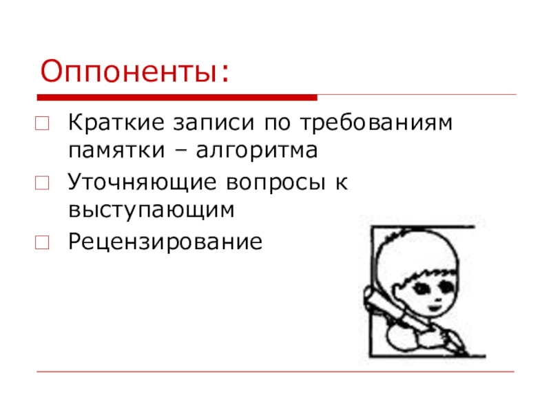 Оппоненты:Краткие записи по требованиям памятки – алгоритмаУточняющие вопросы к выступающимРецензирование