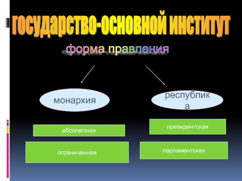 форма правления монархияреспубликаабсолютнаяограниченнаяпрезидентскаяпарламентскаягосударство-основной институт