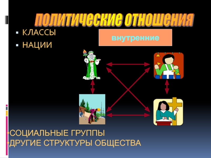 политические отношения КЛАССЫНАЦИИСОЦИАЛЬНЫЕ ГРУППЫДРУГИЕ СТРУКТУРЫ ОБЩЕСТВАвнутренние