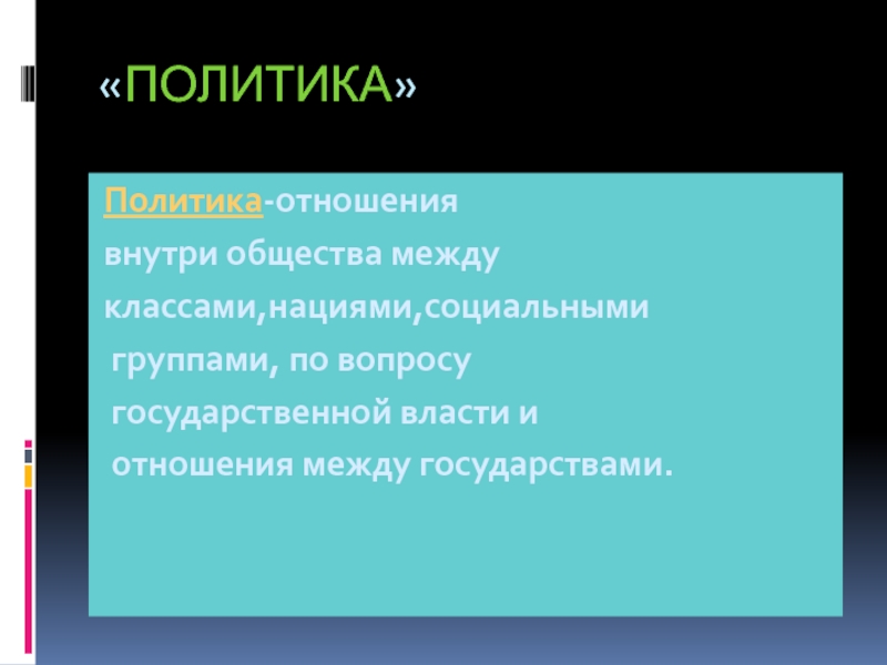 «ПОЛИТИКА»Политика-отношениявнутри общества междуклассами,нациями,социальными группами, по вопросу государственной власти и отношения между государствами.