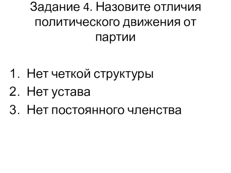 Задание 4. Назовите отличия политического движения от партииНет четкой структурыНет уставаНет постоянного членства