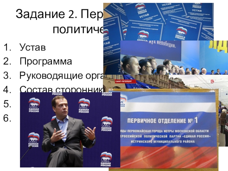 Задание 2. Перечислите признаки политической партииУставПрограммаРуководящие органыСостав сторонниковПервичные отделенияПартийный лидер