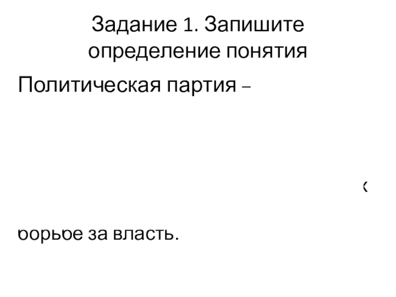 Задание 1. Запишите определение понятияПолитическая партия – это политическая организация, выражающая интересы определенных социальных групп, объединяющая их