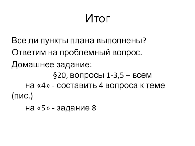 ИтогВсе ли пункты плана выполнены?Ответим на проблемный вопрос.Домашнее задание: