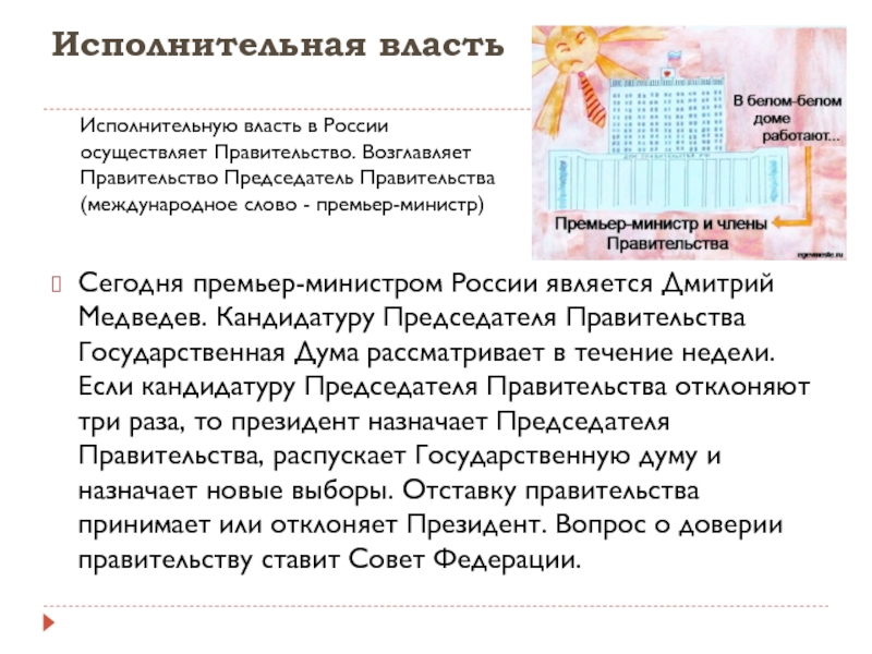Исполнительную власть в России осуществляет Правительство. Возглавляет Правительство Председатель Правительства (международное слово - премьер-министр)