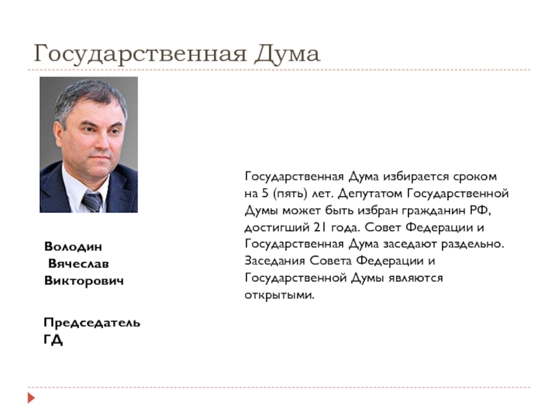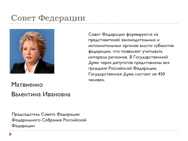 Законодательную власть в России осуществляет Федеральное Собрание — парламент Российской Федерации. Здесь принимаются российские законы. Сначала их пишут в Государственной Думе, а потом отправляют на обсуждение в Совет Федерации. После одобрения Советом Федерации закон направляется на подпись Президенту.
