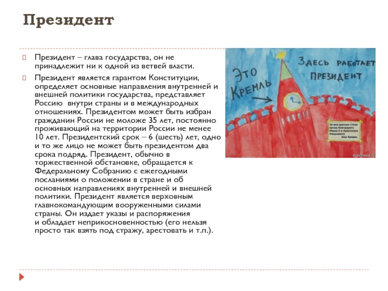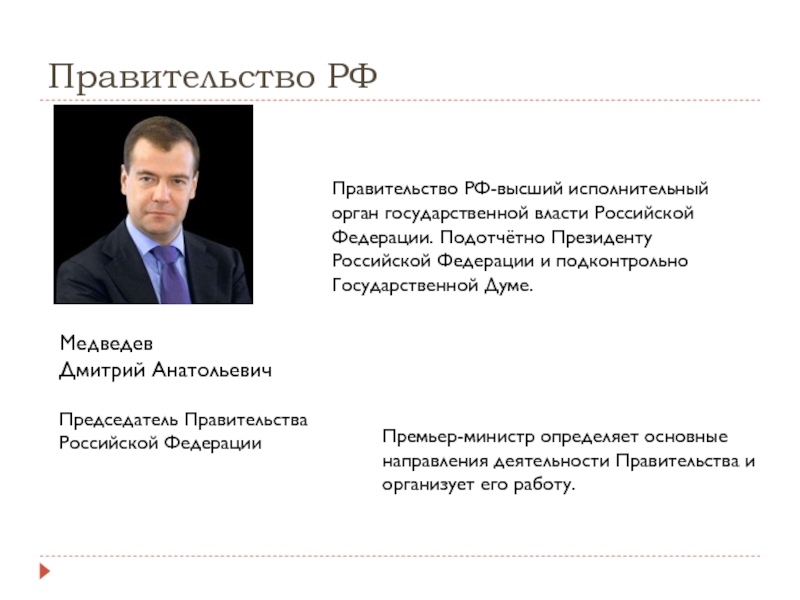 Правительство РФ-высший исполнительный орган государственной власти Российской Федерации. Подотчётно Президенту Российской Федерации и подконтрольно Государственной Думе.